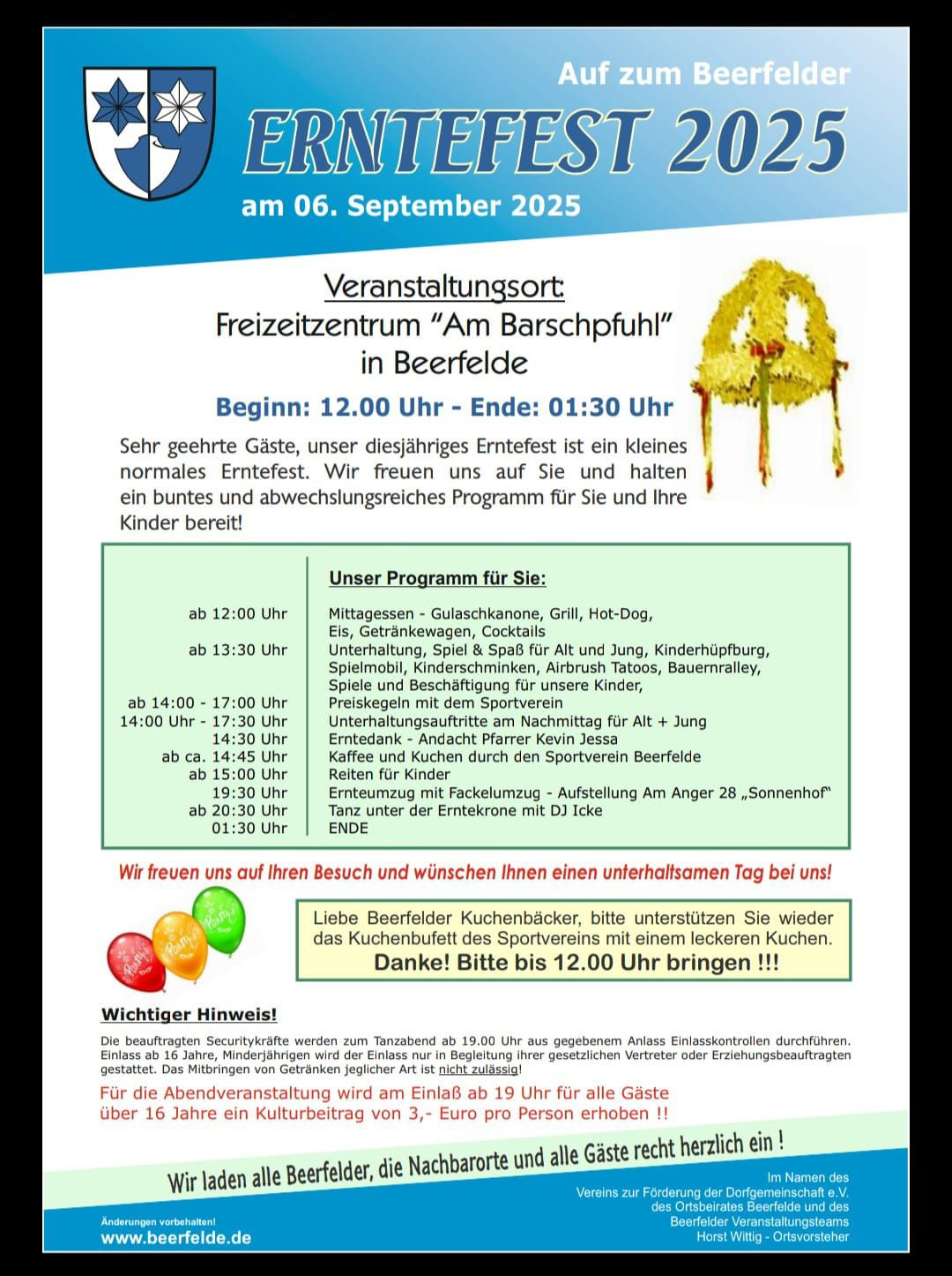 Am 6. September 2025 findet von 12:00 Uhr bis 01:30 Uhr das Beerfelder Erntefest im Freizeitzentrum Am Barschpfuhl statt.