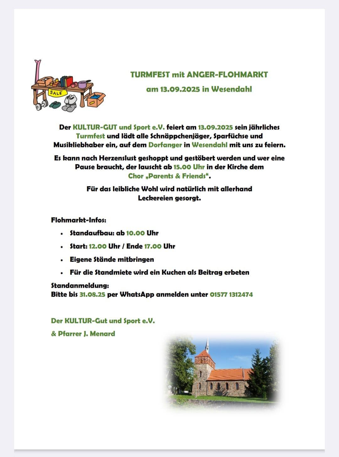 Der Kultur-Gut und Sport e.V. feiert am 13. September 2025 sein jährliches Turmfest und lädt alle Schnäppchenjäger, Sparfüchse und Musikliebhaber ein, auf dem Dorfanger in Wesendahl mit zu feiern.