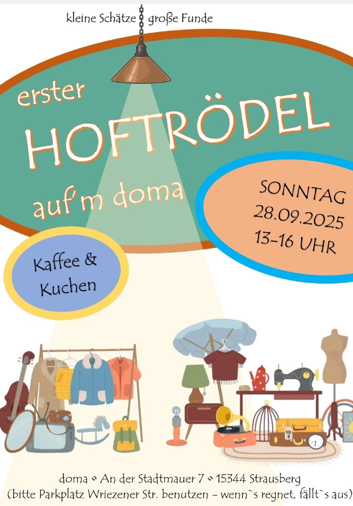 Am Sonntag, den 28. September 2025 findet von 13:00 Uhr bis 16:00 Uhr der erste Hoftrödel auf´m doma, Strausberg An der Stadtmauer 7 statt.