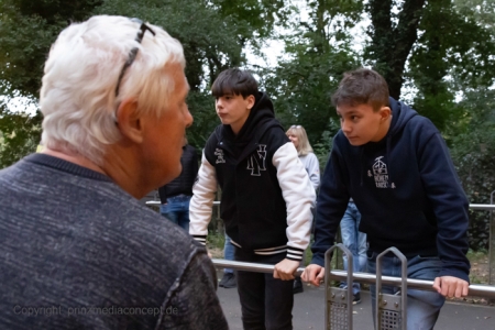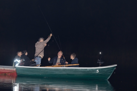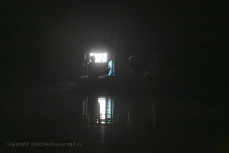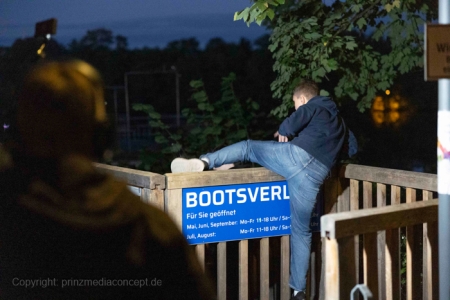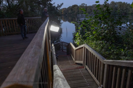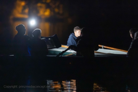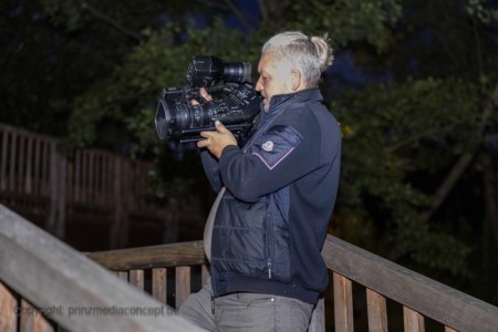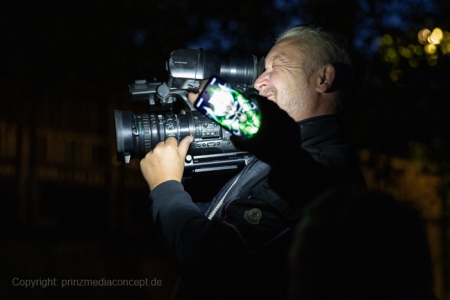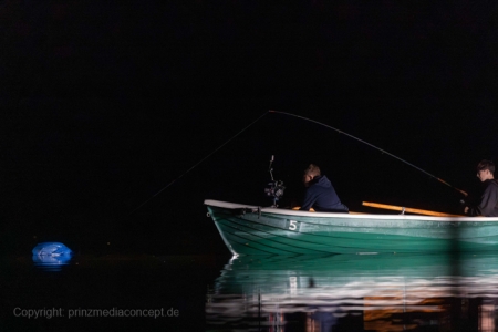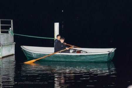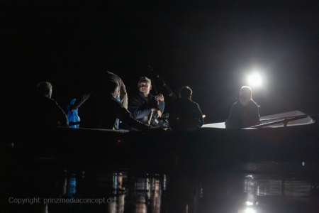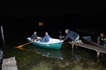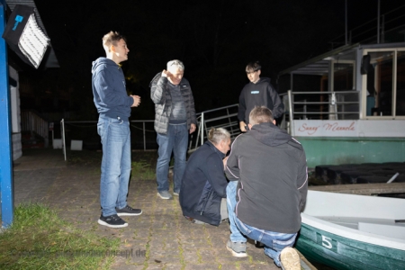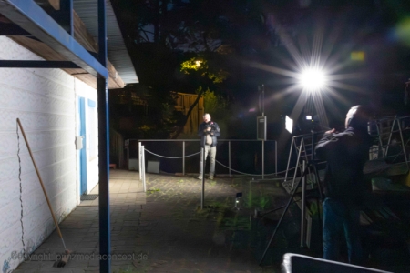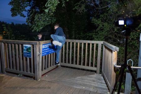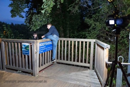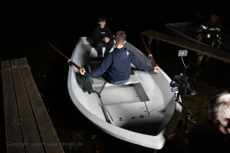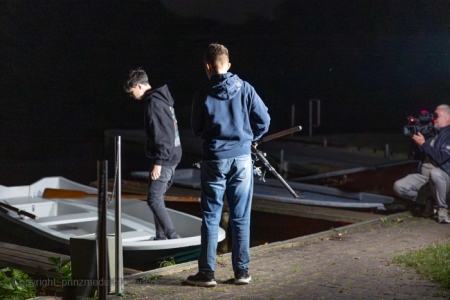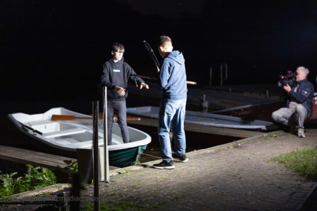 So kletterten zwei Jungen über das Tor des Bootsverleihs, um sich einen Kahn zu „borgen“ und heimlich angeln zu gehen. Das sind Johann Teske (13) und Florian Eisold (12). Die beiden hatten sich zu diesem nächtlichen Dreh bereit erklärt, nachdem Mario Worm in ihrer Schule eine Lesung aus seinen Büchern veranstaltet und Interessenten zum Mitmachen suchte. Neugierig, wie es bei Dreharbeiten zugeht, waren auch die Eltern der Jungs. Alle Akteure und Helfer – mit dabei in traditioneller Nachbarschaftshilfe auch Hagen Stegemann, der überall tatkräftig zupackte –, wurden bis in die Nacht hinein gut versorgt vom Team des Eiscafé des „Hotels Seeschloss“ Bötzsee.