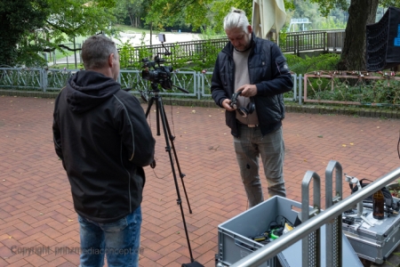 Am Bötzsee ging es darum, den Trailer für die Buchmesse zu drehen. Kameramann Jürgen Richter und sein Bruder Mario Wurm hatten alles dabei, um die Szenarien unter der Aufnahmeleitung von Natalie Worm festzuhalten. Ihnen zur Seite standen nicht nur als Mitwirkende – sondern auch zur Sicherheit aller –, „Feuerwehrmann Volker“, wie er sich selbst vorstellte, sein Kamerad, der „hübsche Martin“ mit viel Erfahrung vor der Kamera und Paul Gerwin sowie Stephan Zisenitz.
