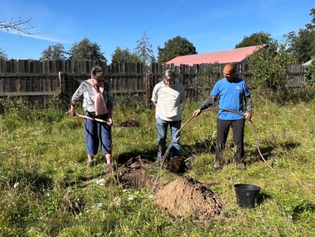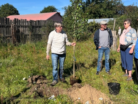 Ein weiterer Höhepunkt des Tages war das Pflanzen junger Obstbäume. Der „Gubener Spiller“, ein Pflaumenbaum, wurde von Beate und Hagen Schurrmann aus Fredersdorf gesponsert. Gemeinsam mit dem Doppeldorf-Nabu-Vorstandsvorsitzenden Uwe Klemm, seinem Stellvertreter Andreas Badalus und Kassenwart Thomas Leidinger bekam der Baum seinen neuen Platz auf der Obststreuwiese. „Bäumchen, Bäumchen, wachse fein, du wirst jetzt hier Zuhause sein“, gab Marmeladen-Beate dem Neuzugang mit auf den Weg.