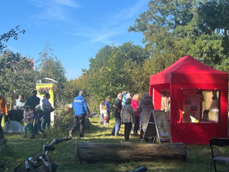 Die beiden benachbarten Ortsgruppen Fredersdorf-Vogelsdorf und Petershagen-Eggersdorf richteten dieses Fest gemeinsam aus. In diesem Jahr auf der Doppeldorf-Streuobstwiese in der Friedhofstraße, im nächsten Jahr in Fredersdorf-Vogelsdorf. „Wir haben uns darauf geeinigt, weil unsere Gemeinde im kommenden Jahr 650-jähriges Jubiläum feiert“, sagt Ralf Haida vom Nabu Fredersdorf-Vogelsdorf. An seinem Stand ist der von der Mosterei Wilke frisch abgefüllte Apfelsaft der Renner. „500 Flaschen waren es bisher. Alles von der Riesenernte auf unserer Streuobstwiese“, sagt Haida. Damit könne vieles im Verein mitfinanziert werden. Hier liegen auch die Unterschriftenlisten gegen drei gigantische, zehngeschossige Betontürme für ein Rechenzentrum in Vogelsdorf aus. „Warum gerade mitten im Ort? Schließlich gibt es Alternativen für das Bauvorhaben, zum Beispiel im Industriegebiet oder hinter dem Möbelkaufhaus“, heißt es dazu.