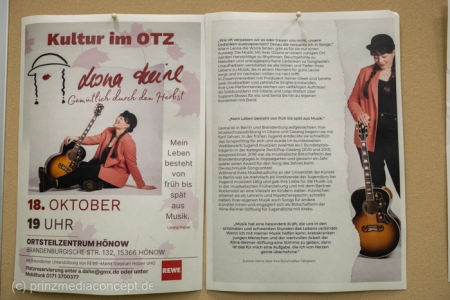 Am Samstag, den 18. Oktober 2025 war Leona Heine im Ortsteilzentrum Hönow, Brandenburgische Straße 132 ab 19:00 Uhr zu erleben. Mein Leben besteht von früh bis spät aus Musik sagte die Sängerin, davon konnte sich das Publikum überzeugen.