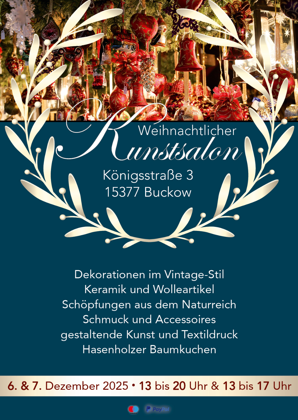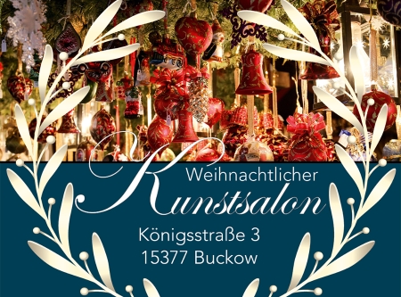Einen Weihnachtlichen Kunstsalon gibt es am 6. Dezember 2025 von 13:00 Uhr bis 20:00 Uhr und am 7. Dezember 2025 von 13:00 Uhr bis 17:00 Uhr in der Königsstraße 3 in Buckow.
