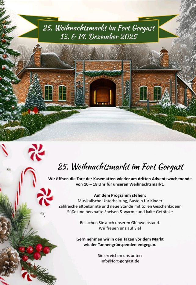 Der 25. Weihnachtsmarkt im Fort Gorgast findet am 13. und 14. Dezember 2025, dem dritten Adventswochenende, jeweils von 10:00 Uhr bis 18:00 Uhr statt