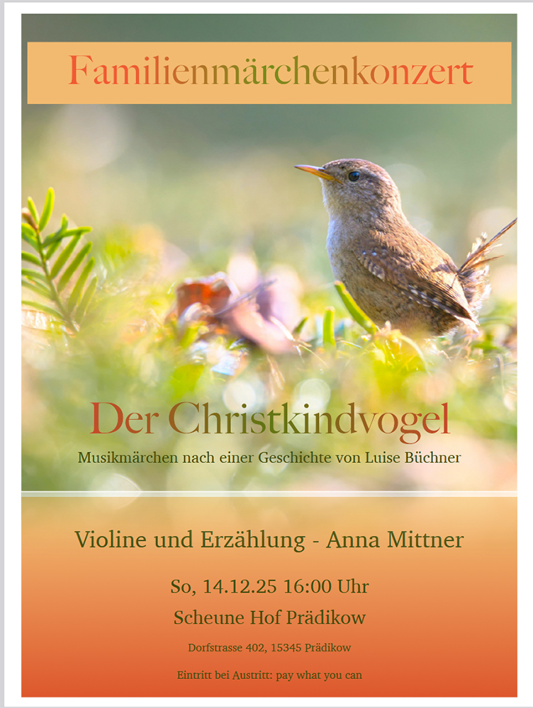 Herzliche Einladung zu einem Stück voller Klänge, Vogelgezwitscher und Weihnachtsgedanken. Am Sonntag 14.12.2025 wird es bunt in der Scheune des Hof Prädikow, wenn Anna Mittner mit ihrer besten Freundin, der Geige, zu erzählen, zu spielen und zu fragen beginnt.