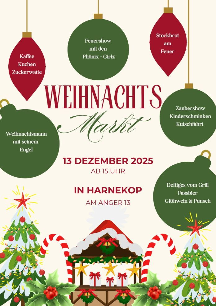 Der diesjährige Weihnachtsmarkt in Harnekop findet am Samstag, den 13. Dezember 2025 ab 15:00 Uhr Am Anger 13 statt.