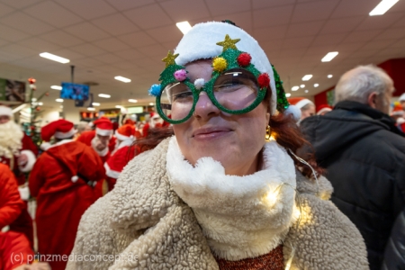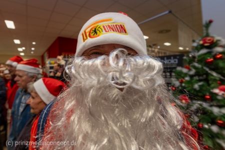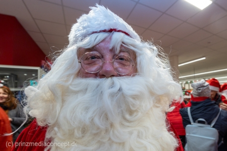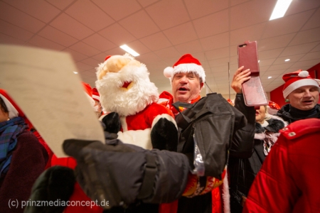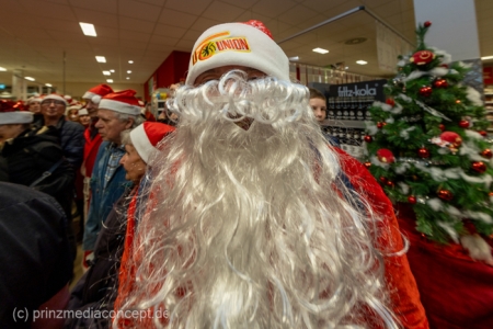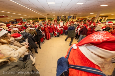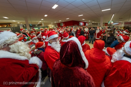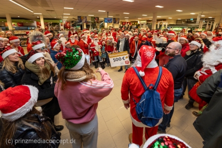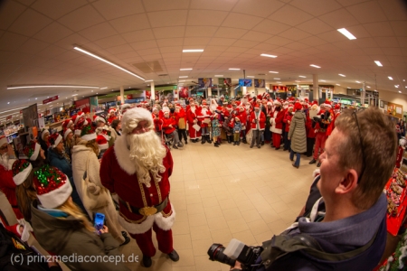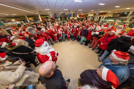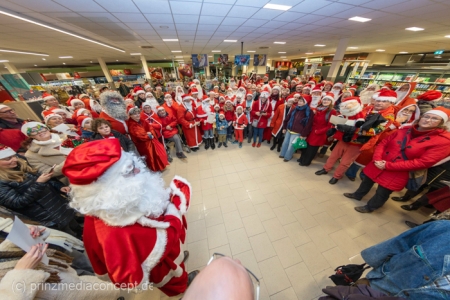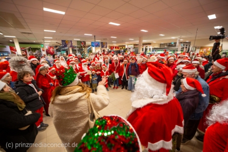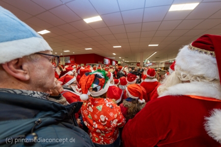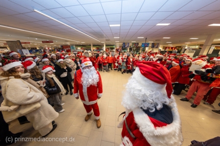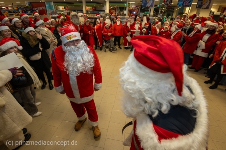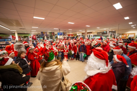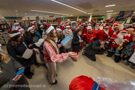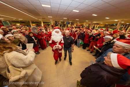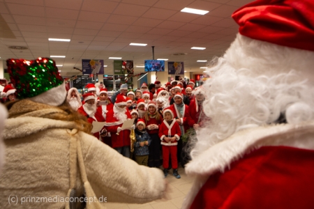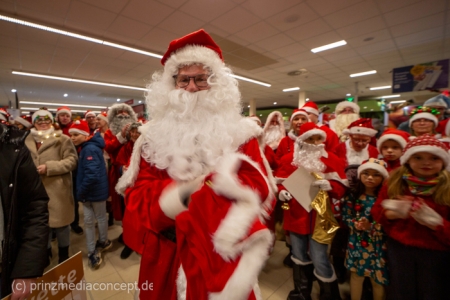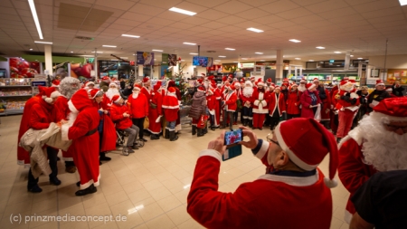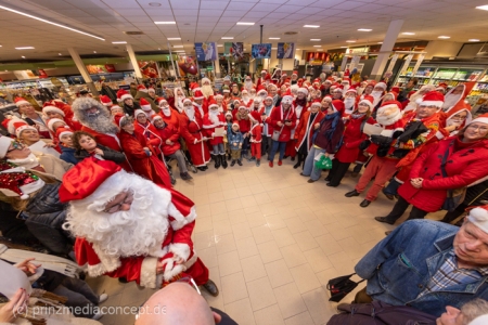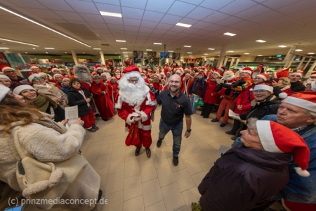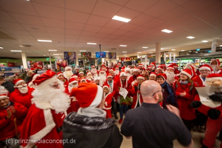 Die Augen der Kinder, die mit ihren Eltern zu einem ganz normalen Wochenend-Einkauf in den Neuenhagener REWE-Markt gekommen waren, wurden immer größer. Denn es wimmelte hier nur so von Weihnachtsmännern. So viele auf einmal hatten sie noch nie gesehen. Was war los? Bürgermeister Ansgar Scharnke hatte all die Weihnachtsmänner mobilisiert. Er hatte nämlich mit Marktleiter Björn Gädeke darum gewettet, dass er imstande sei, 50 Weihnachtsmänner in den Markt zu bringen. Und es kamen weit mehr. Das Gedränge wurde so groß, dass sogar der Gang zur Kasse freigeräumt werden musste. Über 100 Rotmützen und Weißbärte waren es schließlich, die gemeinsam für Stimmung sorgten und Weihnachtslieder sangen. Dirigiert wurde der sporadische Weihnachtsmänner- und -frauenchor von Loud&Proud-Chorleiterin Chiiara.