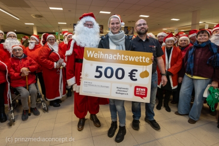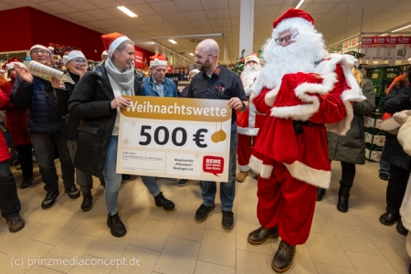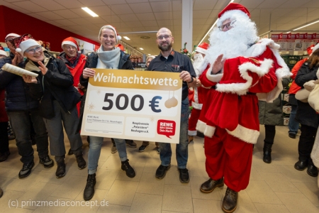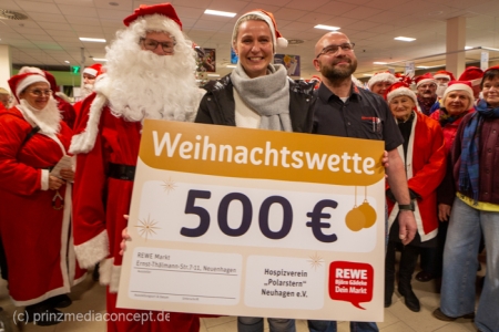 Aber worum ging es eigentlich bei dieser ungewöhnlichen Wette? Um einen 500-Euro-Scheck! Der wurde dann vom Wette-Verlierer, dem Marktleiter, gemeinsam mit Bürgermeister Scharnke (in seinem Weihnachtsmannkostüm kaum zu erkennen) an Daniela Wraske vom Verein Polarstern überreicht.