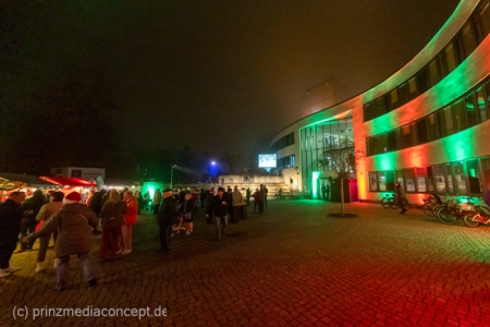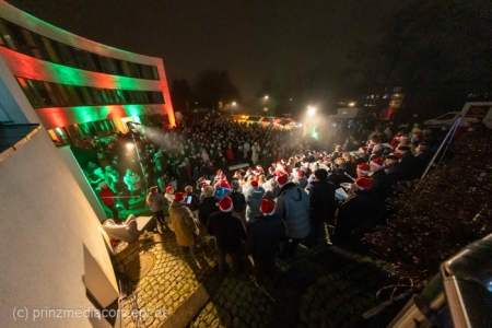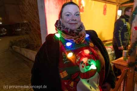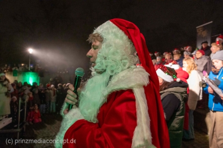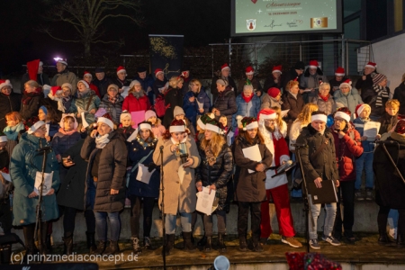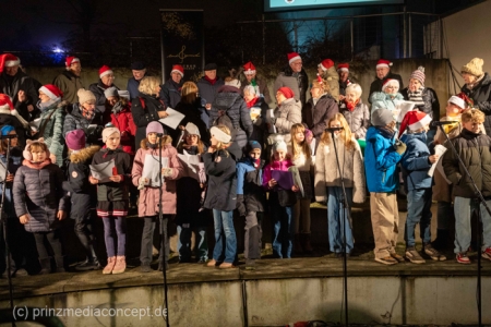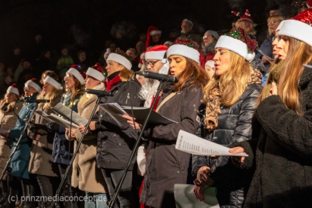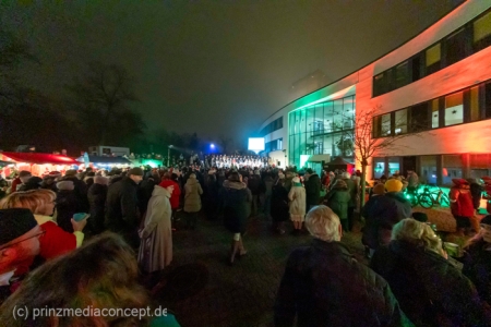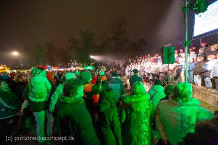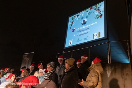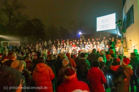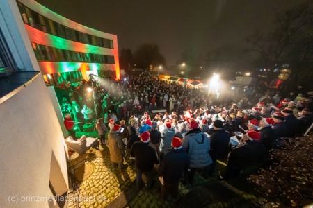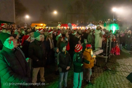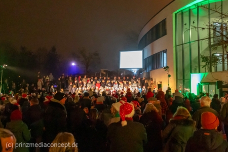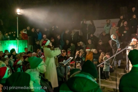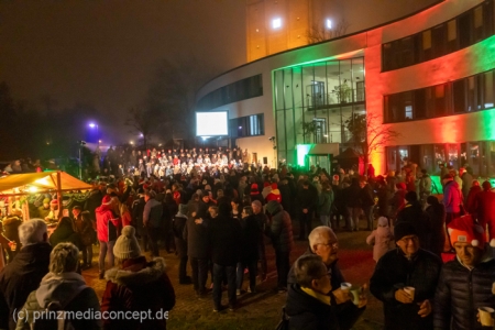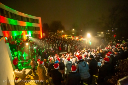 Damit war das abendliche Weihnachtstreffen noch lange nicht vorbei. Gemeinsam zogen viele der Weihnachtsmänner und -frauen zum Rathaus, wo es schon nach Glühwein und Bratwurst duftete. Wie schon zur Tradition geworden, trafen sich hier die Neuenhagener zum Adventssingen. Vier Chöre waren dabei: Männerchor Frohsinn 1880, der Frauenchor, der Gemischte Chor Loud&Proud und die Goethe-Spatzen aus der benachbarten Grundschule. Moderator Torsten Walter hatte noch einen 5. Chor anzukündigen: nämlich das sangesfreudige Publikum!