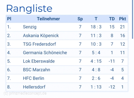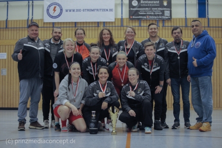 Das Turnier war bis zum Schluss in toller Kulisse mit sehr fairen Spielen. Vor allem die Mädchen von Rot Weiß Hellersdorf 90 e.V. konnten sich noch über ein hart erkämpftes Unentschieden gegen den HFC Berlin im letzten Spiel des Turniers freuen. Am Ende setzten sich die Damen aus Senzig vor denen von Askania Cöpenick und den Damen der TSG Fredersdorf durch. Germania Schöneiche belegte den vierten Platz vor Lok Eberswalde, BSC Marzahn, HFC Berlin und Hellersdorf. Die Stimmung in der Halle war während den ganzen Turniers echt gut. Die ersten 3 Plätze erhielten einen Pokal und einen Siphon Cupfer von der Sozietätsbrauerei und Brennerei Altlandsberg.