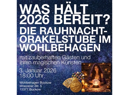 Schon zum vierten Mal machen wir anlässlich der Nächte, an denen der "Schleier der Maya" besonders dünn sein soll, das Wohlbehagen zur Oraktelstube – und laden euch ein, am 3.1.2026 um 18 Uhr mit uns und unseren Gästen in die Zukunft zu schauen. Was sagen die Sterne, was verraten uns die Karten und weitere Orakeltechniken über die kommenden 12 Monate?