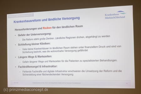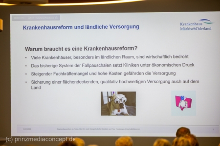 Die Geschäftsführerin Thielemann hob hervor, dass die Reformen auch Chancen bieten und wird diese aktiv mitgestalten. Der Landkreis Märkisch-Oderland steht geschlossen hinter den Einrichtungen der Krankenhaus Gruppe. Das Krankenhaus in Seelow wird bereits umgestaltet. So wird dort ab 19. Januar eine Kurzzeitpflege angeboten. Viele Ärzte sind auch an anderen Standorten tätig, um eine gute Versorgung anzubieten. Beispielsweise wird die gynäkologische Sprechstunde in Seelow von einer Ärztin des Strausberger Krankenhauses angeboten.