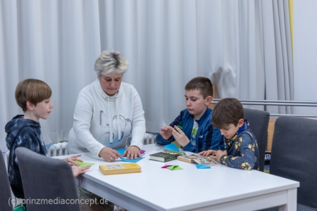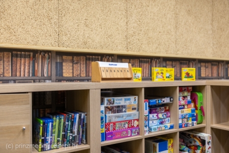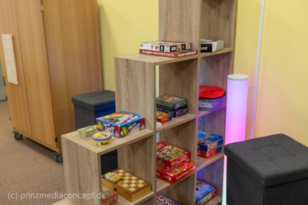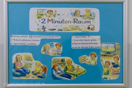 Direkt neben der Bibliothek befindet sich der Zwei Minuten Raum der von den Kindern selbst so benannt wurde. Hier können die Kinder in den Büchern lesen, zur Ruhe kommen oder Spiele spielen.