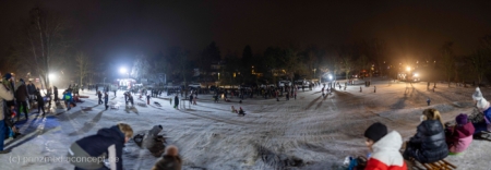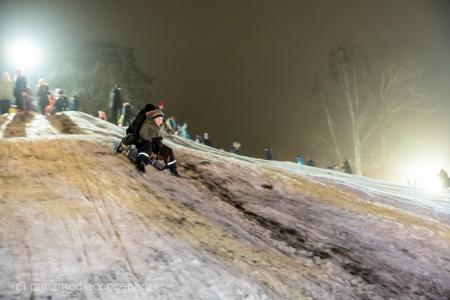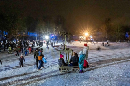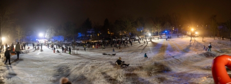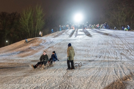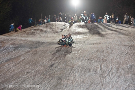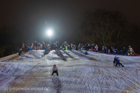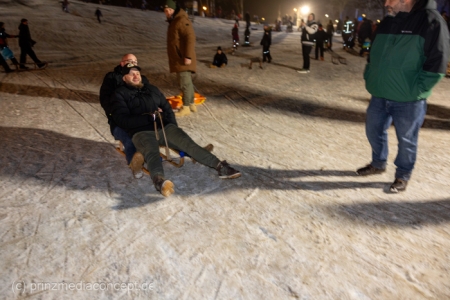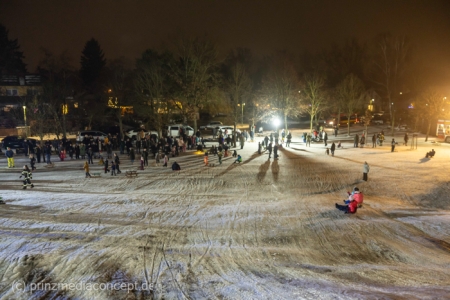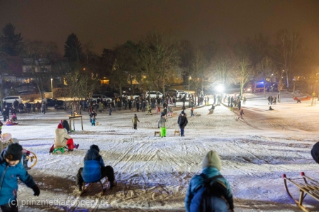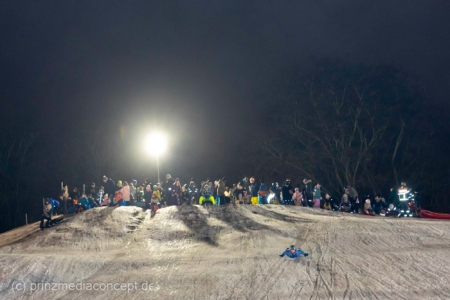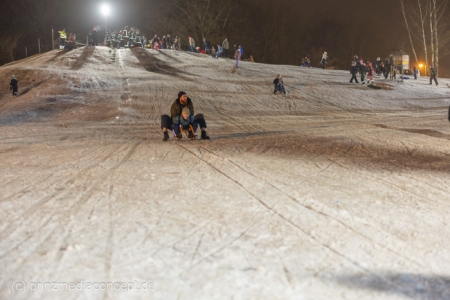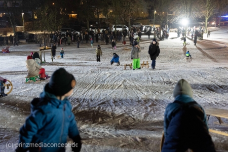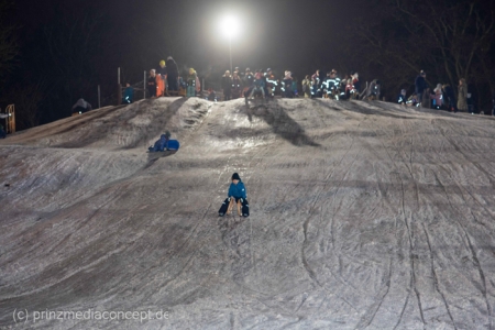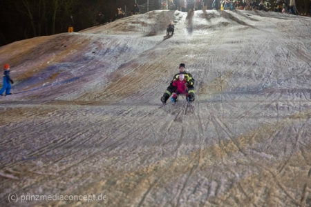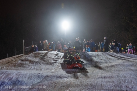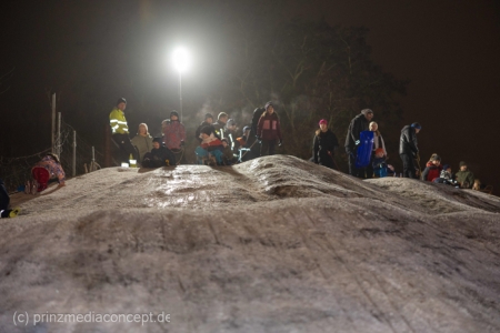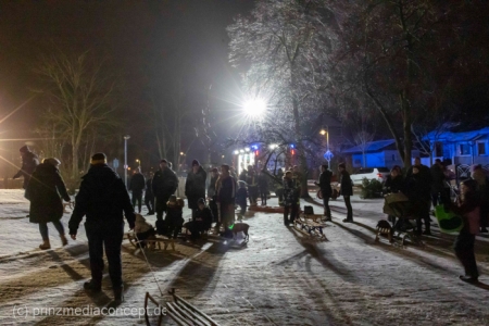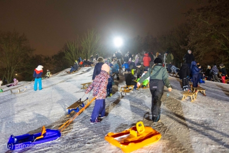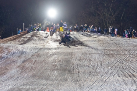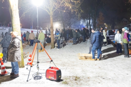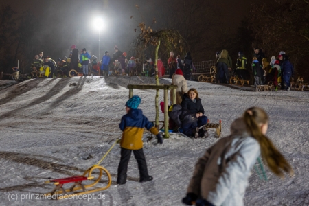 „Der Hügel wurde einst aus dem Aushub vor allem von der Schule aufgeschüttet“, erinnert sich Gemeindevertreter Johannes Kliegel, der gleich um die Ecke groß geworden ist und nun auch mit Freude dem Treiben zuschaut – einen Schlitten hat er nicht dabei. Und immer wieder bis die feuerwehr das Licht ausmacht, stellen sich alle ordentlich an, um aufs Neue abwärts zu rasen. Der Schnee hält diesen Andrang tatsächlich stand.