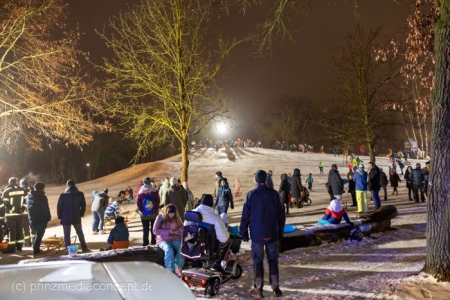 Das schon von weitem sichtbare Blaulichtgewitter hat am Dienstagabend so gar nichts Bedrohliches an sich. Im Gegenteil, es scheint fröhlich zu blinken. Und so ist es auch. Begleitet vom Jubel Hunderter Schlittenfahrer, bietet sich am Rodelberg am Giebelsee ein außergewöhnliches Erlebnis.