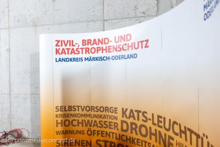 Landrat Schmidt lobte den Standort mitten im Landkreis und somit zentral für die Feuerwehren. Auf dem Gelände wird ein 6 m hoher Übungsturm für den Feuerwehrsport errichtet. Strausbergs Bürgermeisterin Stadeler dankte dem Landkreis für die erneute Investition im Gewerbegebiet Nord. Der Polier der Baufirma ANES sprach den Richtspruch und ließ die Richtkrone über das Bauwerk schweben.