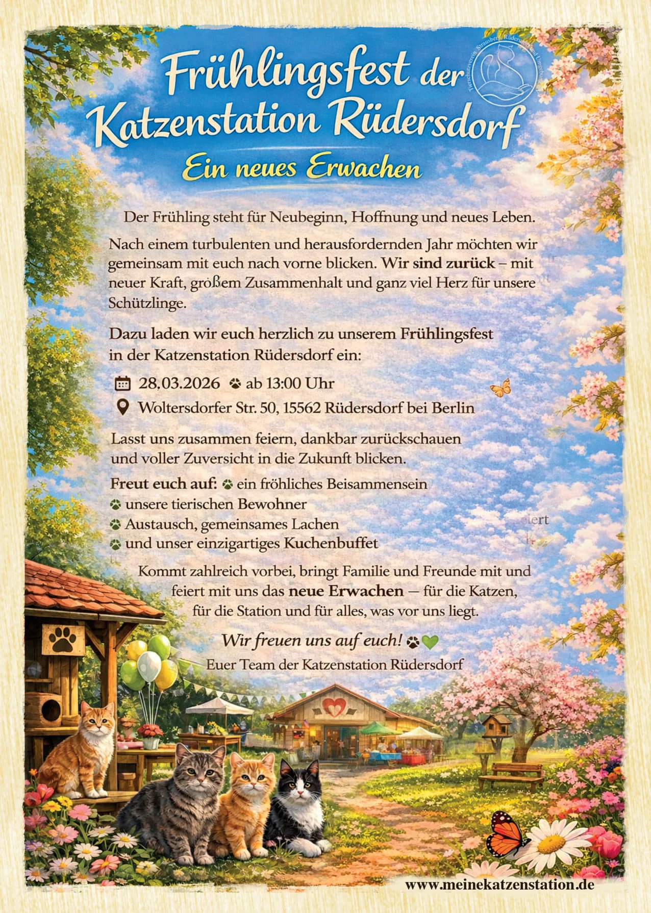 Am 28.03. um 13.00 Uhr laden wir euch herzlich zu unserem Frühlingsfest in die Katzenstation Rüdersdorf ein.