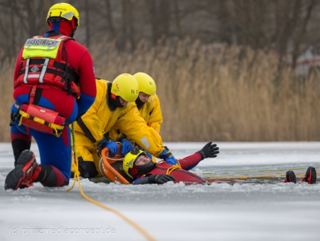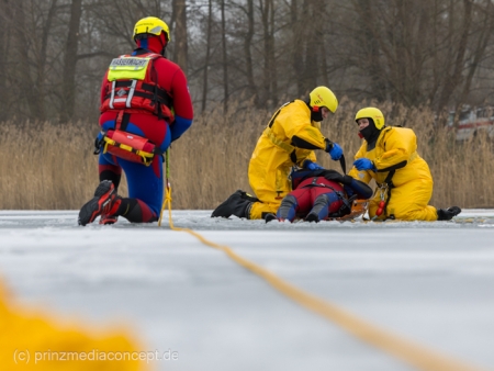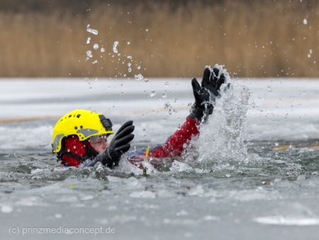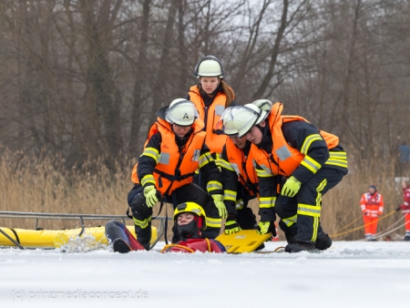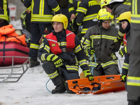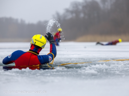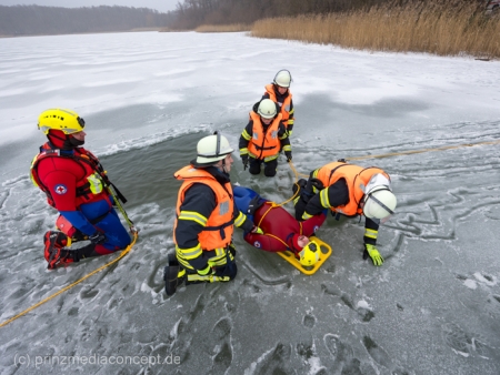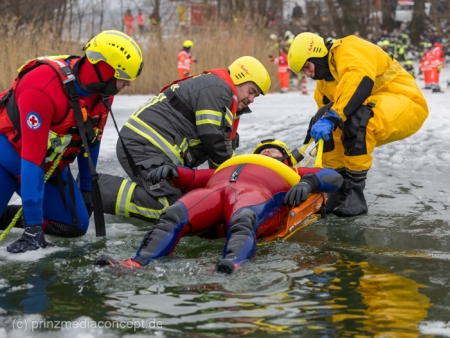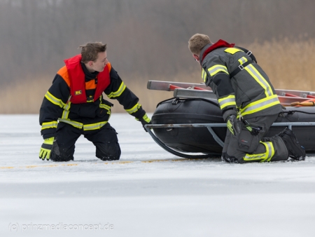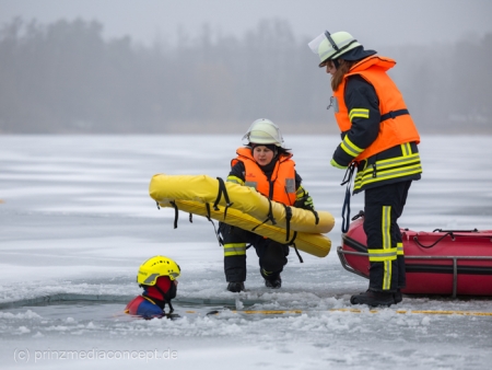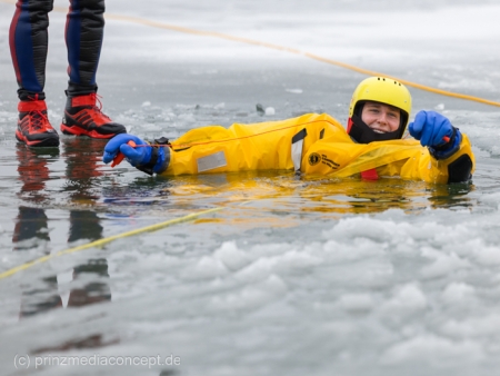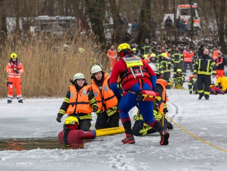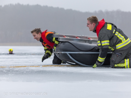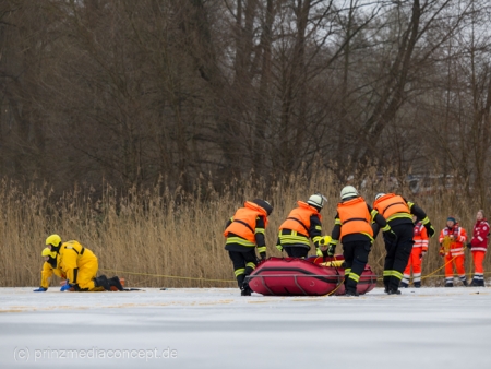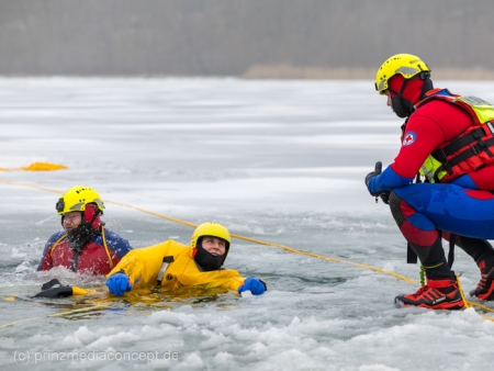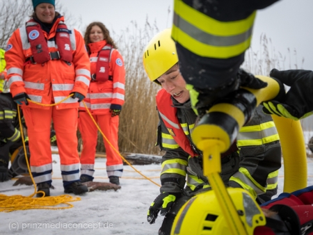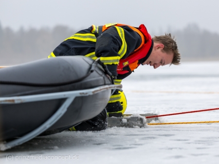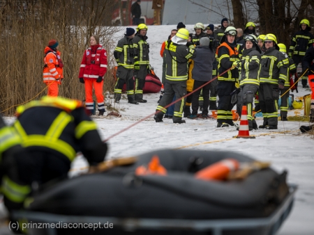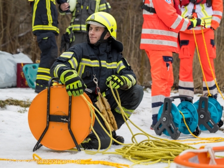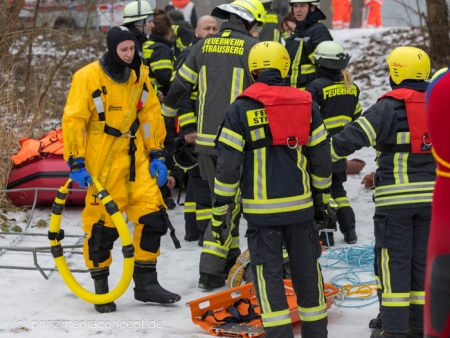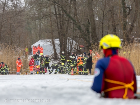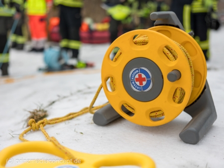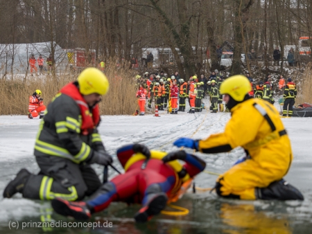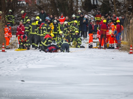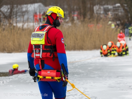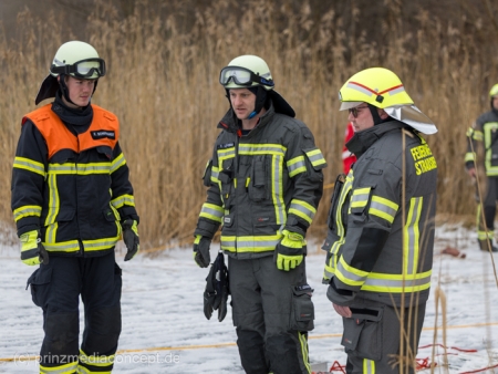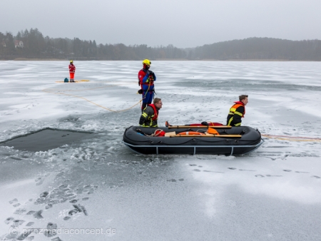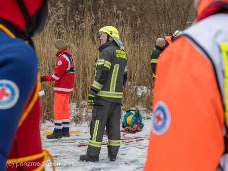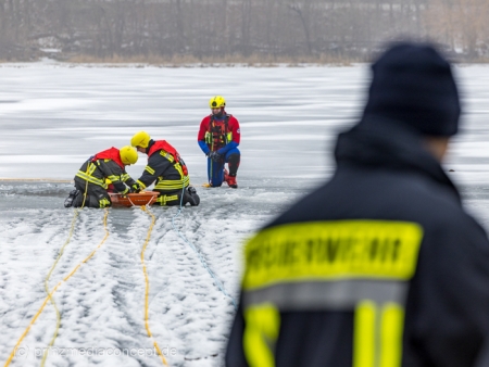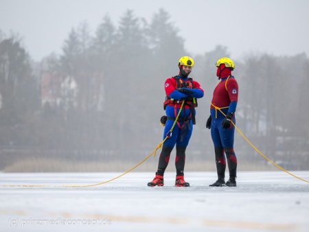 Heute hatten Feuerwehren die Chance, gemeinsam mit der Wasserwacht zu trainieren. Selten bietet sich diese Gelegenheit und daher waren Feuerwehren aus den umliegenden Orten mit einem großem Aufgebot vor Ort. Viele verrichten ehrenamtlich dieses Aufgabe. Stunden der Vorbereitung, schweres Gerät, Schlauchboote, Leitern, Gleittragen. Drei Eislöcher boten Raum für verschiedene Rettungstechniken. Jede Handgriff, jede Bewegung, jede Variante wurde ausprobiert, geübt, angepasst. Vom sicheren Zugang über Rettungsleinen bis zu Schlepp- und Grifftechniken.