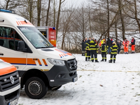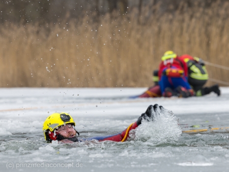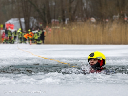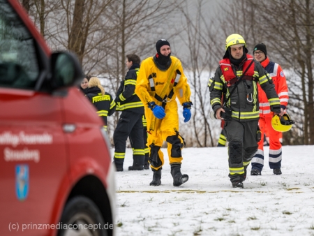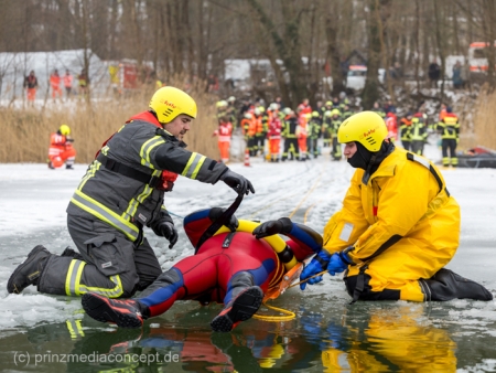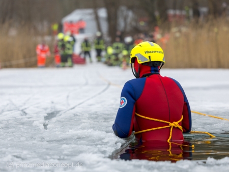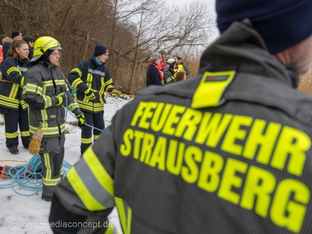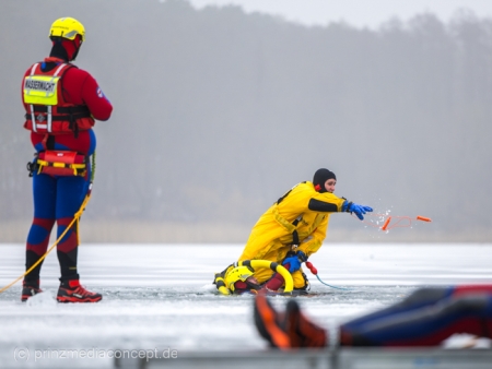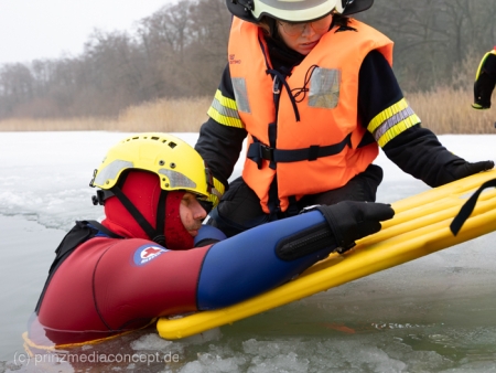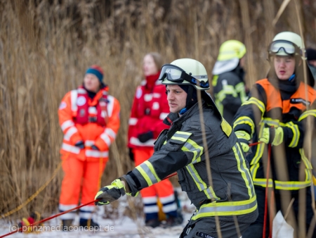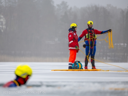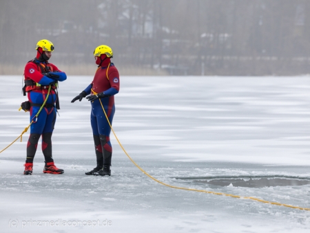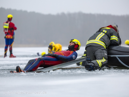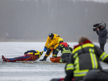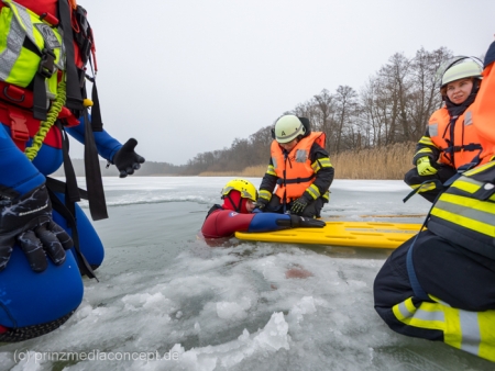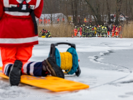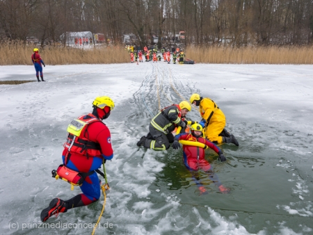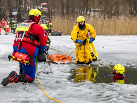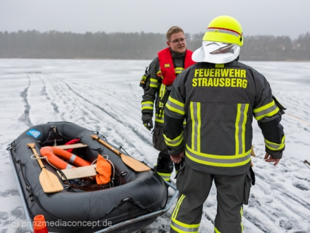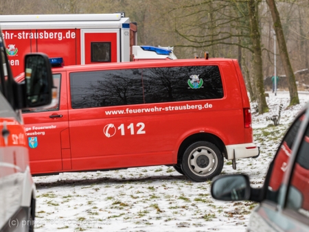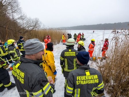 Straussee heute. Knapp über null Grad. Die Eisdecke taut an, Wasser schimmert darunter, leichter Nebel zieht über das Wasser und die Ufer. Für viele ein Grund, vorsichtig zu sein oder drinnen zu bleiben. Für die Wasserwacht Strausberg und die freiwilligen Feuerwehren der Umgebung war es die perfekte Gelegenheit für eine Live-Übung, die ernsthafter nicht sein könnte. Menschen retten, die eingebrochen sind. Auf dem Eis. Im eiskalten Wasser. Unter Bedingungen, die jeden Schritt, jeden Griff fordern.