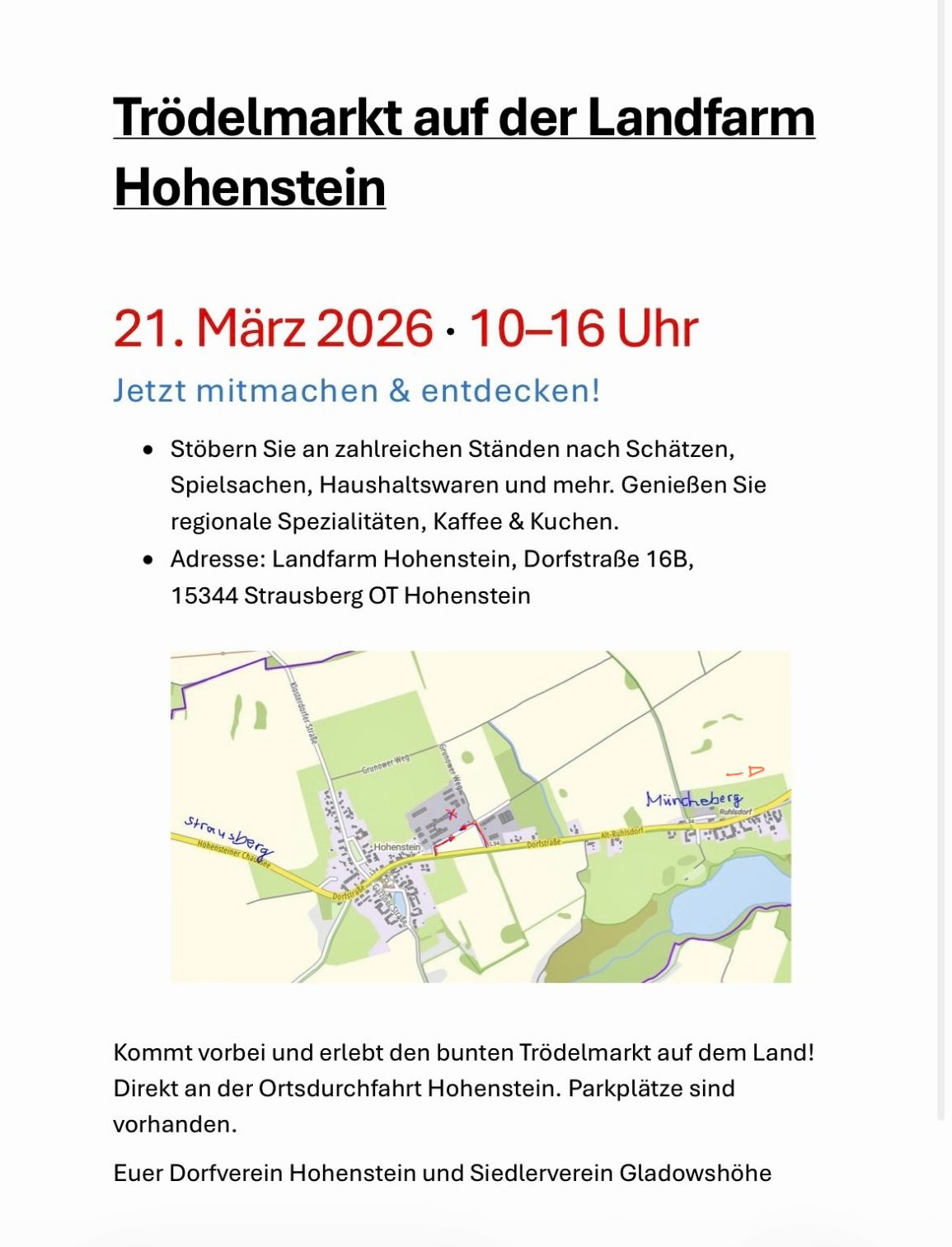 Der Trödelmarkt ist direkt an der Ortsdurchfahrt Hohenstein, es sind reichlich Parkplätze vorhanden. Der Trödelmarkt wird organisiert vom Dorfverein Hohenstein und dem Siedlerverein Gladowshöhe.