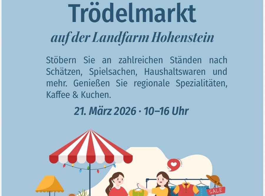 Am 21. März 2026 gibt es von 10:00 Uhr bis 16:00 Uhr einen Trödelmarkt in den Räumlichkeiten der Landfarm in Hohenstein.