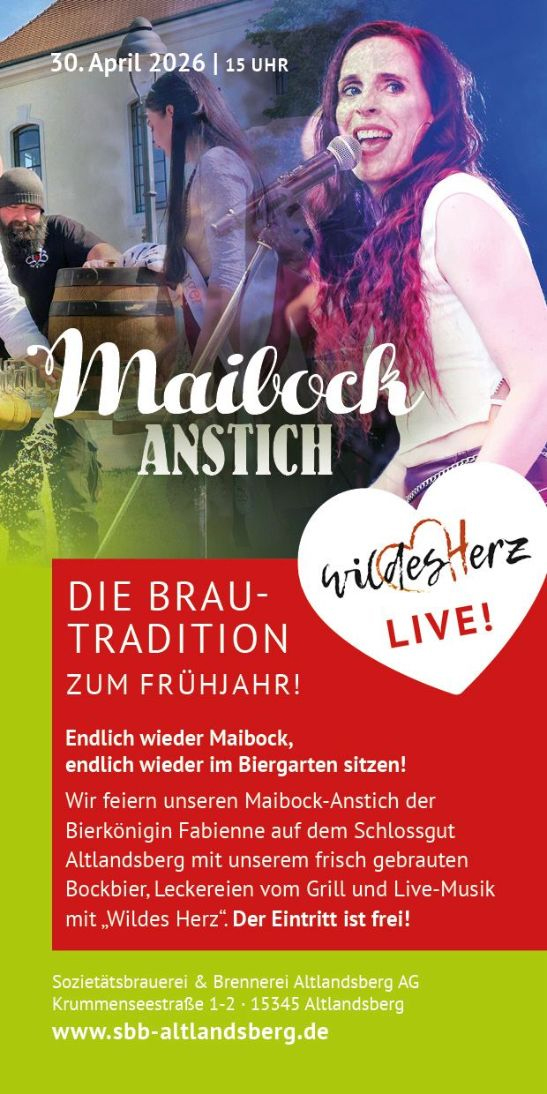 Vor dem Königlichen Brauhaus im Biergarten des Schlossgutes Altlandsberg gibt es am 30. April 2026 gegen 15:00 Uhr den feierlichen Mai-Bockbier Anstich. Den Anstich nimmt der Altlandsberger Bürgermeister gemeinsam mit der 4. Bierkönigin Fabienne vor. Angeboten wird leckeres vom Grill und Livemusik mit Wildes Herz. Es wird ein helles Bockbier mit ca. 6,5 % Alkohol gebraut (2.700 Liter).