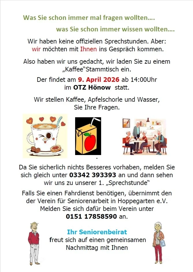 Wir stellen Kaffee, Apfelschorle und Wasser - Sie Ihre Fragen