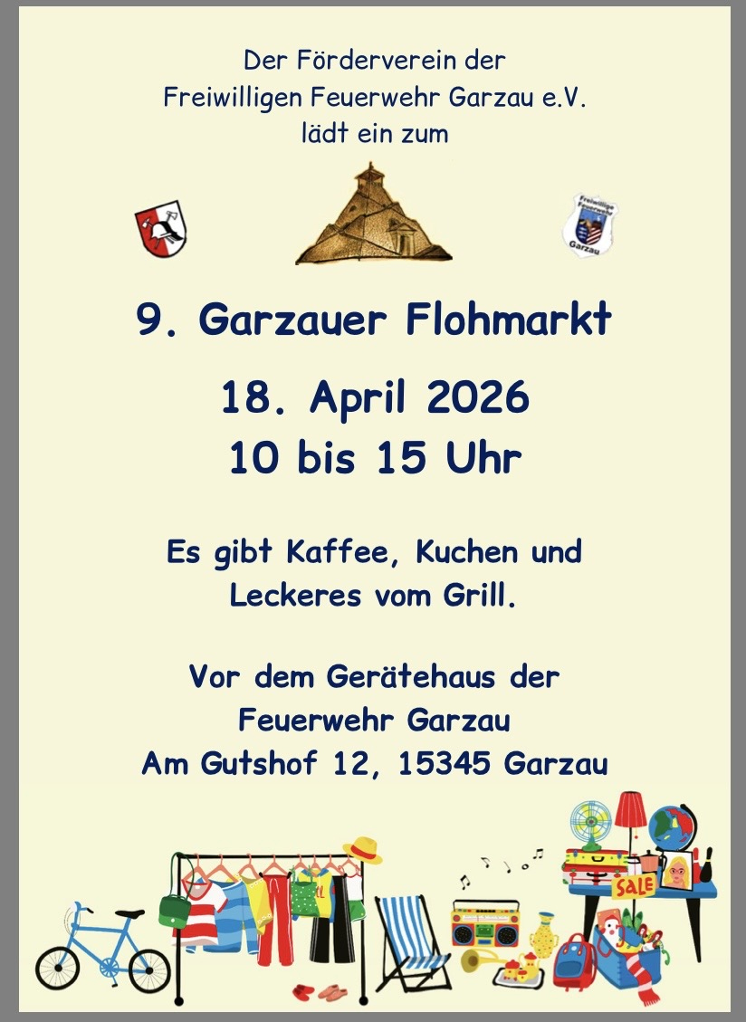 Am 18. April 2026 wird von 10:00 Uhr bis 15:00 Uhr wird der 9. Garzauer Flohmarkt vor dem Gerätehaus der Freiwilligen Feuerwehr Garzau (Am Gutshof 12) vom Förderverein der Freiwilligen Feuerwehr Garzau organisiert. Zusätzlich gibt es Kaffee, Kuchen und Leckeres vom Grill.