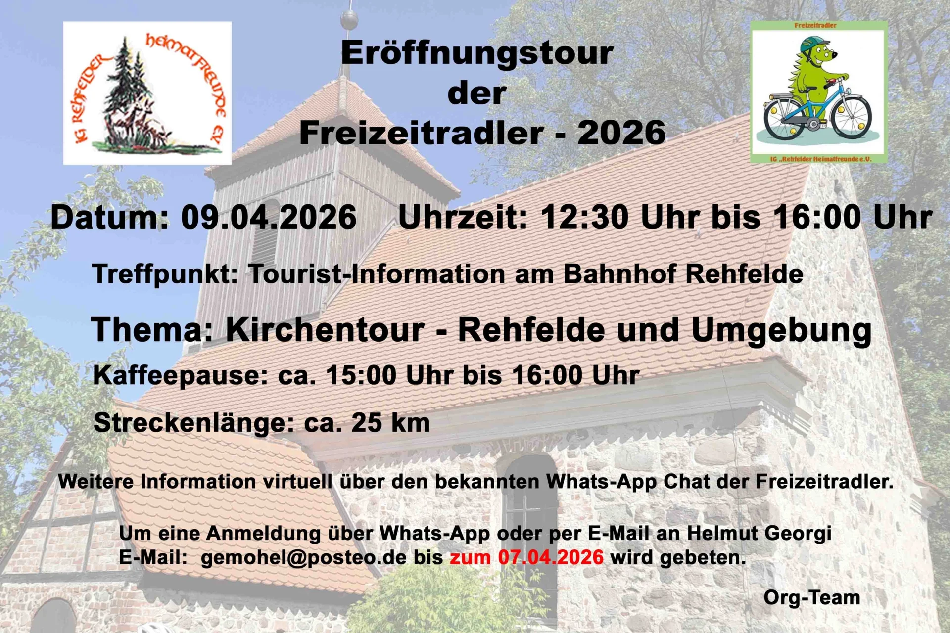 Auftakt mit einer Besichtigung des neu gestalteten Kirchhofes an der Kirche in Rehfelde-Dorf. Weiterfahrt zum Bahnhof Herrensee und Beginn des Rundkurs. Von dort Fahrt nach Hennickendorf bis zur Kirche Lichtenow-Dorf. Dann über einen Landweg vorbei an der ehemaligen Schule Lichtenow in Richtung Lichtenow Bruch, Querung Lichtenower Mühlenfließ, Fließweg Richtung Zinndorf. Von dort nach Werder über den Liederweg nach Garzau. Bei Zeitmangel gleich von Zinndorf nach Rehfelde Bahnhof zur Kaffeepause von 15.00 Uhr bis 16.00 Uhr im Café Reh des Familienzentrums. Insgesamt verläuft der Rundkurs auf 21 km gut befahrener Rad- und teilweise auch Feldwege.