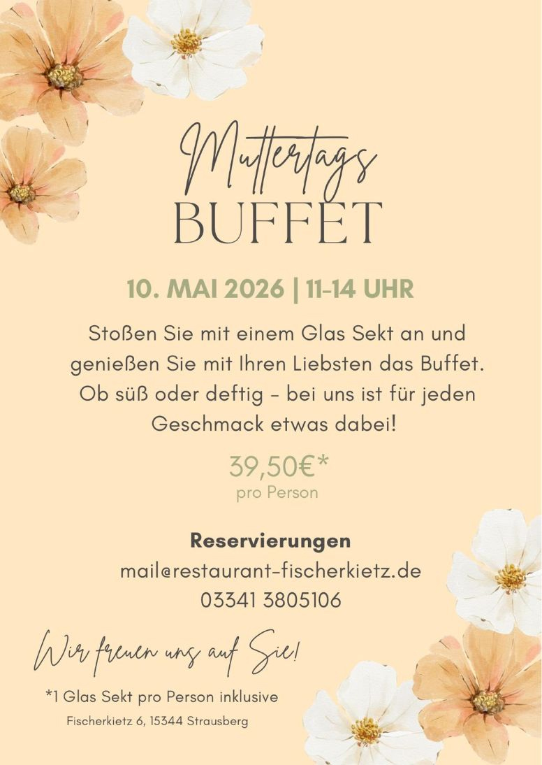 Am 10. Mai 2026 lädt das Restaurant Am Fischerkietz in Strausberg von 11:00 Uhr bis 14:00 Uhr zum Muttertags-Brunch ein. Erleben Sie den tollen Blick auf den Straussee und dazu einen köstlichen Brunch. Für 39,50 Euro pro Person ist die Teilnahme möglich. Eine Reservierung unter 03341 - 380 51 06 oder unter mail@restaurant-fischerkietz.de ist dringend empfohlen. Ein Glas Sekt pro Person ist inklusive.