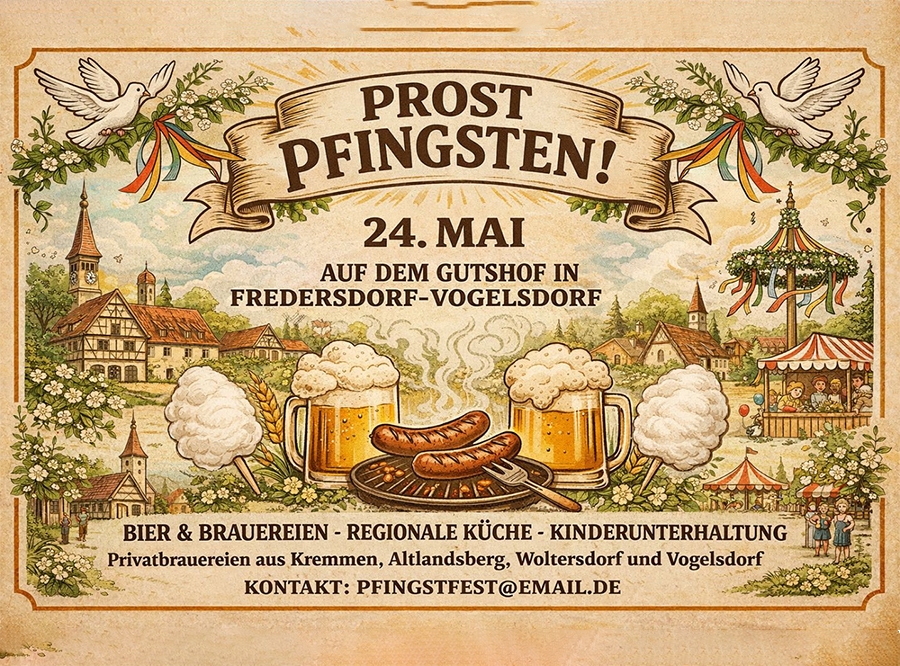 Am 24. Mai 2026 findet von 14:00 Uhr bis 22:00 Uhr das Prost Pfingsten! Fest auf dem historischen Gutshof in Fredersdorf-Vogelsdorf statt. Vier Brauereien aus Kremmen, Altlandsberg, Woltersdorf und Vogelsdorf stellen ihre Biere vor. Regionale Küche und Kinderunterhaltung wird geboten.