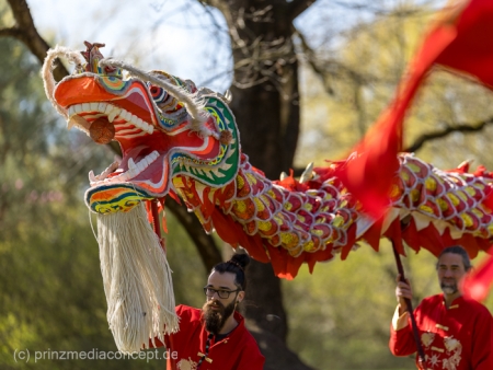 Ich laufe ein Stück, bleibe hier und da stehen. Stände mit mannshohen Geschicklichkeitsspielen, irgendwo fliegen Mikado-Stäbe durcheinander, ein paar Meter weiter sitzen Familien über großen Brettspielen und lachen, diskutieren, wetteifern. Es wirkt alles leicht. Ungeplant. Genau richtig an diesem Tag. Auf der Bühne am Koreanischen Garten geht es Schlag auf Schlag: Offizielle Eröffnung, dann direkt rein in traditionelle Tänze und Musik. Bunte Gewänder im Takt, der Blick wandert automatisch mit. Die Wiese davor ist längst voll, darüber liegt dieser Duft von asiatischen Köstlichkeiten.