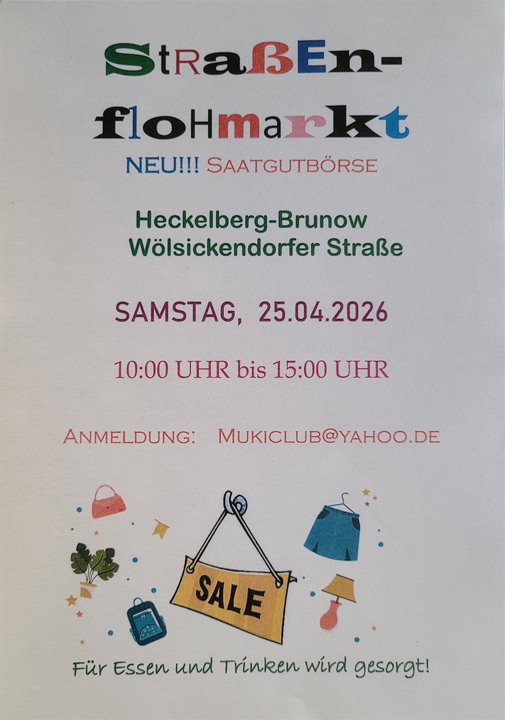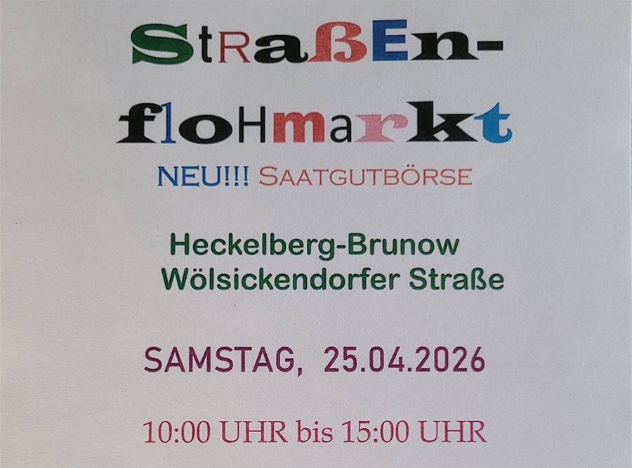 Am Samstag, den 25.04.2026 findet von 10:00 Uhr bis 15:00 Uhr in Heckelberg-Brunow (Wölsickendorfer Straße) ein Straßenflohmarkt mit Saatgutbörse statt. Für Essen und Trinken wird gesorgt.