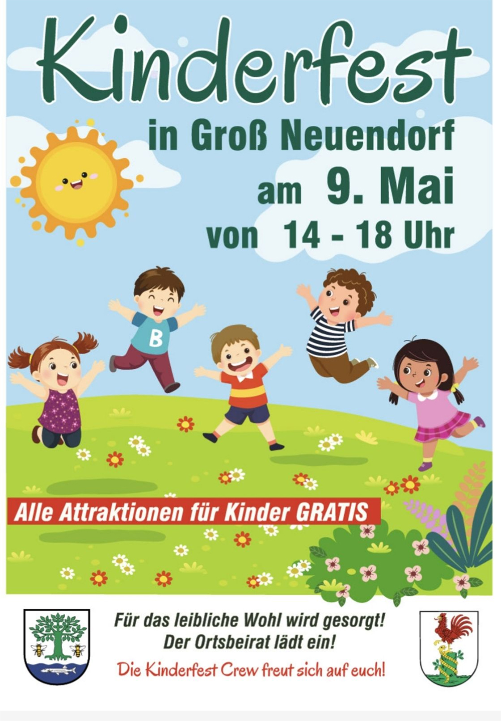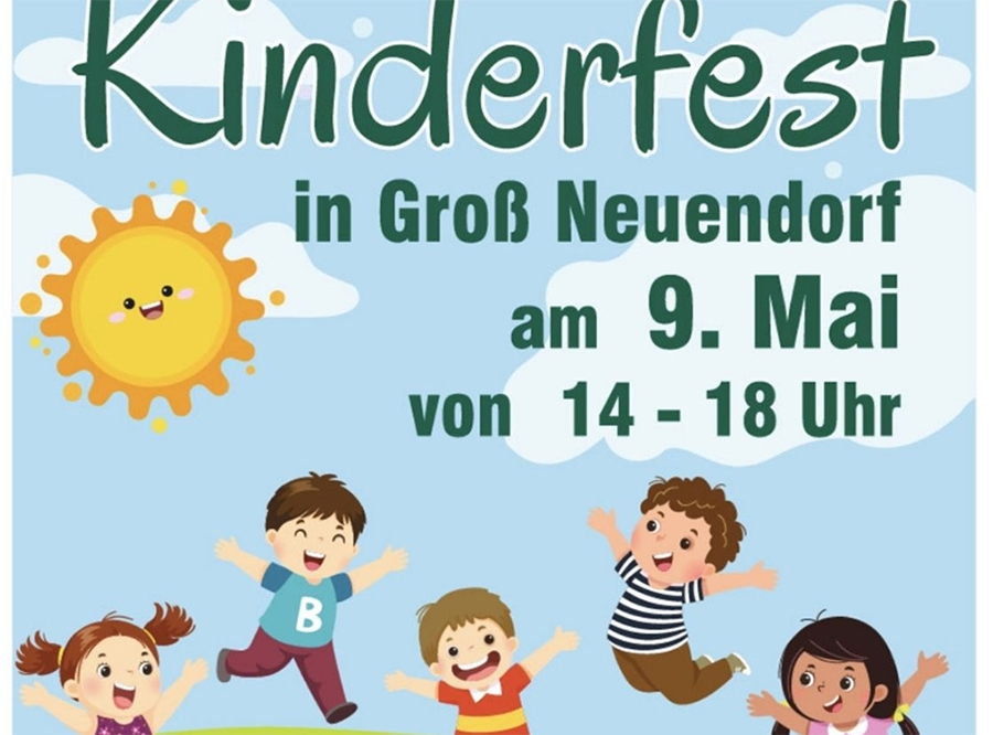Am Samstag, den 9. Mai 2026 findet von 14:00 Uhr bis 18:00 Uhr ein Kinderfest in Groß Neuendorf statt, zu dem der Ortsbeirat herzlich einlädt. Die Kinderfest Crew freut sich auf jeden Besucher. Alle Attraktionen für Kinder sind Gratis.