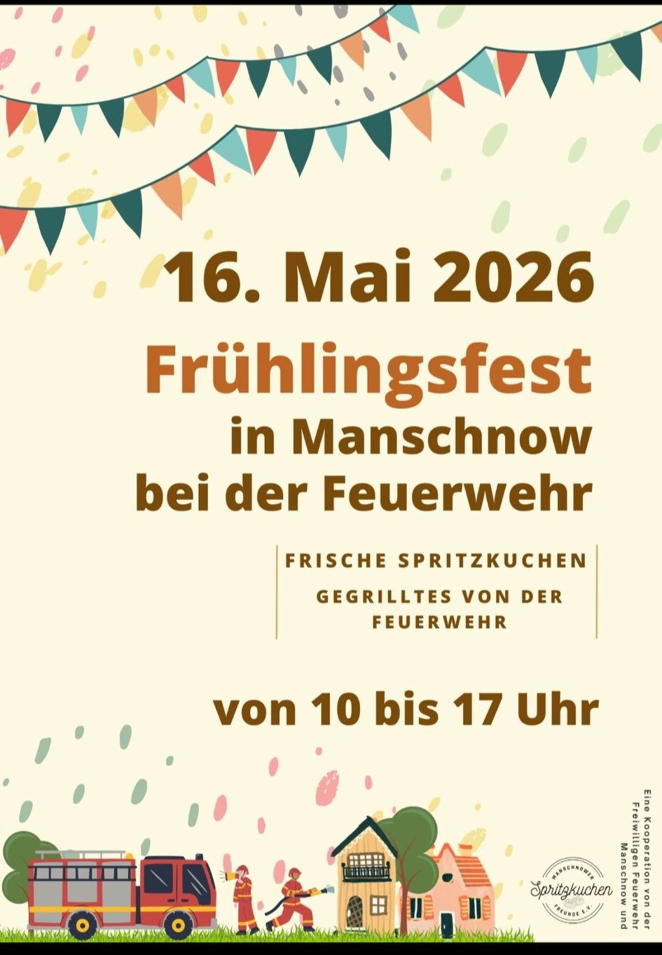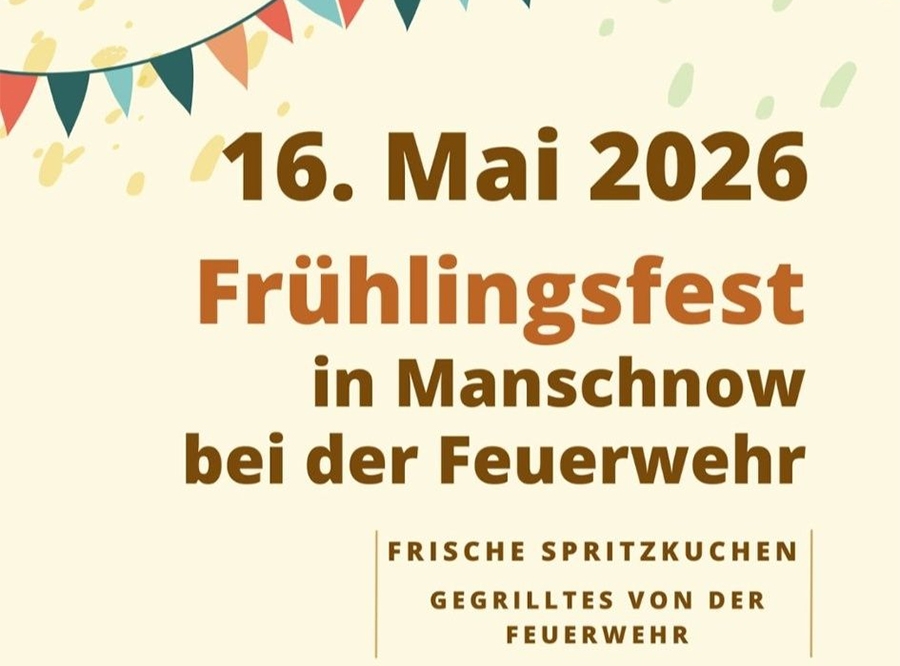 Am Samstag, den 16. Mai 2026 findet von 10:00 Uhr bis 17:00 Uhr das Frühlingsfest bei der Freiwilligen Feuerwehr in Manschnow statt.