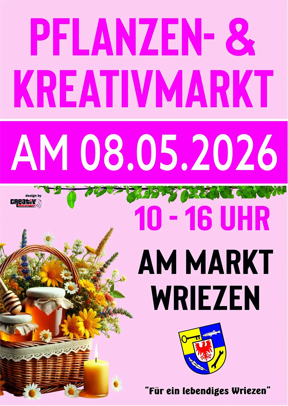 Am Freitag, den 08. Mai 2026 findet von 10:00 Uhr bis 16:00 Uhr auf dem Markt in Wriezen en Pflanzen und Kreativmarkt statt.
