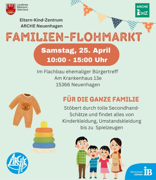 Am Samstag, den 25. April 2026 findet von 10:00 Uhr bis 15:00 Uhr ein Familienflohmarkt im Flachbau (ehemaliger Bürgertreff) Am Krankenhaus 13e in Neuenhagen statt.