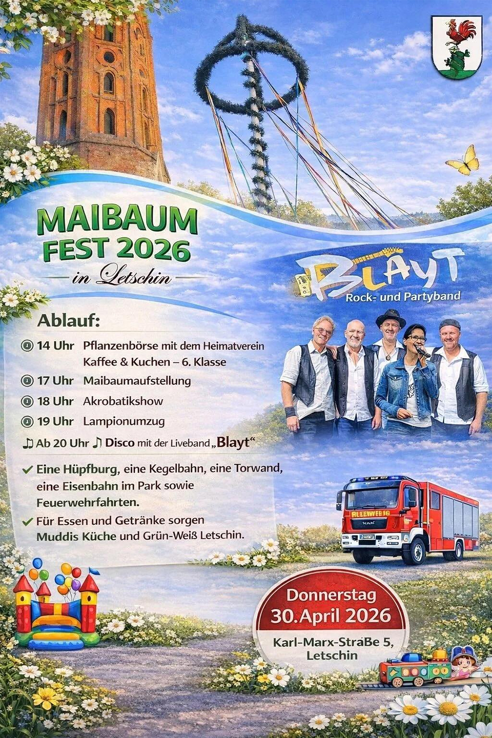 Am Donnerstag, den 30. April 2026 findet ab 14:00 Uhr das Maibaum Fest 2026 in Letschin (Karl-Marx-Straße 5) statt.