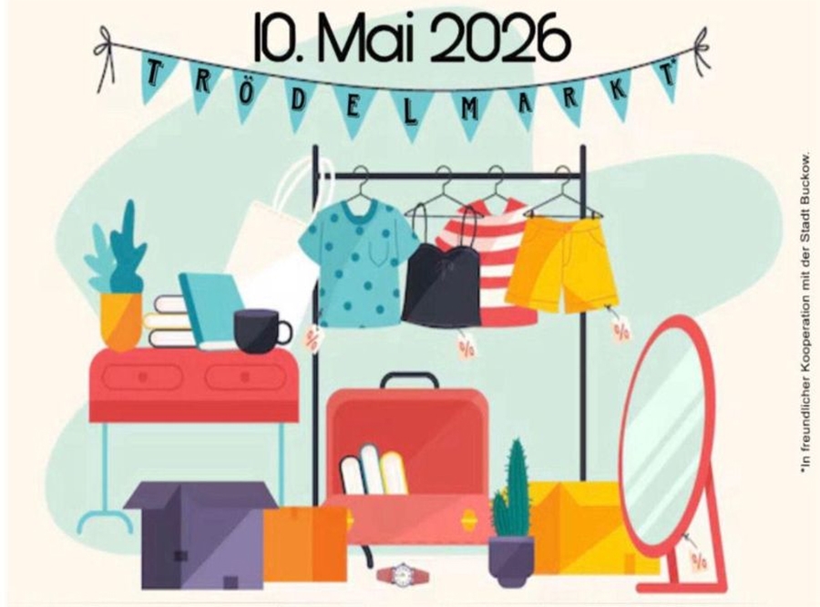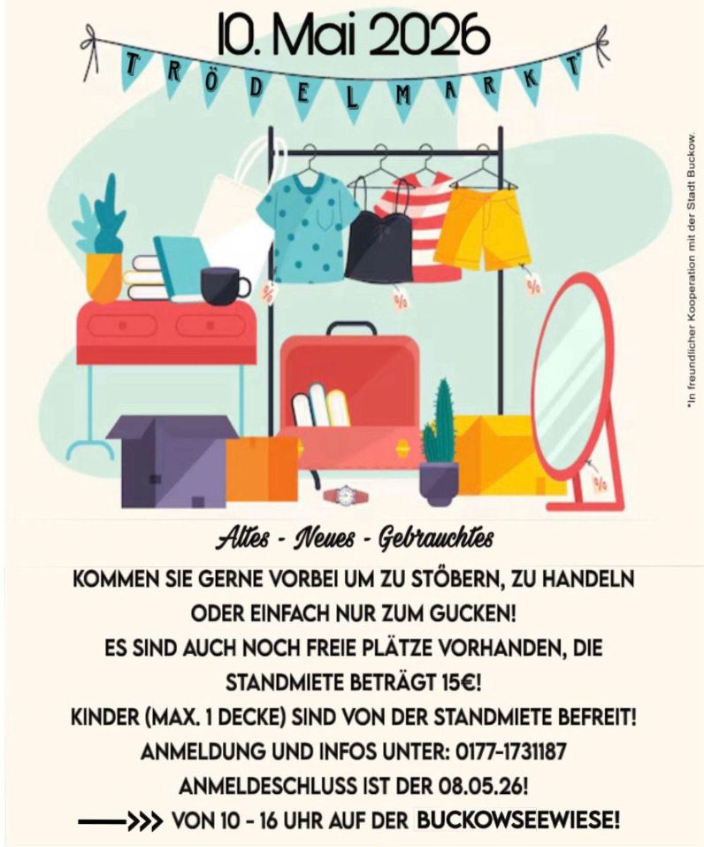 Am 10. Mai 2026 wird von 10:00 Uhr bis 16:00 Uhr auf der Buckowseewiese ein Trödelmarkt veranstaltet.