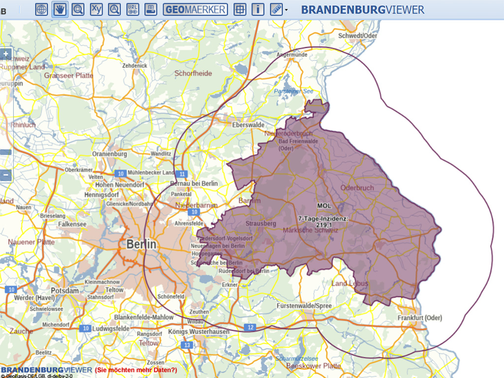 Am 10.01.2021 meldete der Landkreis Märkisch-Oderland eine 7 Tage Inzidenz von 219,7 je 100.000 Einwohner. Das heißt dass für die Bewohner den Landkreis nur im 15 km Unkreis verlassen können. Frankfurt / Oder, Fürstenwalde, Erkner, Bernau und Angermünde sowie einige Teile von Berlin dürfen noch als Reise- oder Besuchsziel eingeplant werden. Schwedt, Königs Wusterhausen und Beeskow liegen schon außerhalb des Bereiches.