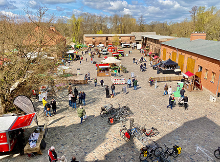 Regionale Produkte, regionale Künstlerinnen und Künstler, regionale Küche, regionale Energie, regionale Lieferketten – wenn es um die Verzahnung mit der Region geht, sieht sich das Altlandsberger Schlossgut als Botschafter. „Vor ein paar Jahren hat sich der Landrat einmal gewünscht, dass sich Altlandsberg als Tor zur ländlichen Region entwickelt,“ erklärt Schlossgut-Chef sein Credo. „Unter dem Motto ,Land.Kultur.Gut’ ist unser Markenkern seit knapp drei Jahren die Regionalität. Dafür haben wir letztes Jahr den Marketingpreis des Landtourismus in Brandenburg gewonnen, zudem war ich persönlich auch Genussbotschafter im Land.“ Auch den Tourismuspreis des Landes Brandenburg gab es 2020 für die Altlandsberger. Das Team des Schlossgutes entwickelt seit 2018 regionale Kultur-Veranstaltungsreihen, präsentiert regionale Produkte im Shop der Touristinfo, knüpft örtliche Netzwerke in Handel und Wirtschaft, um immer wieder ein Forum zu bieten für die Spezialitäten der Region. Sogar das Holz für die Nahwärme auf dem Gut kommt aus der Nachbarschaft. „Am besten kann man unsere Liebe zur Region auf unseren Regional- und Wochenmärkten erleben,“ freut sich Ruebsam. „Ausgesuchte Qualität in schönem Ambiente mit den besten Lieferanten aus der Region bis zu den polnischen Nachbarn – kein Wunder, dass die Märkte inzwischen Publikumsmagneten sind.“ An jedem letzten Samstag im Monat ist Markt-Tag in Altlandsberg. Immer knüpft das Schlossgut auch die Verbindungen zur Kulturszene vor Ort – in der Reihe „Local Heroes“ gibt es Musik aller Stilrichtungen von Künstlerinnen und Künstlern aus der Nachbarschaft. Bestes Beispiel ist die inzwischen auch aus Radio und TV bekannte Singer-Songwriterin Leona Heine aus Fredersdorf, die im Neuenhagener Jugendclub Blaupause als Teenie angefangen hat und mit der Gegend verwachsen ist. Sie spielt immer wieder mit großem Erfolg in ihrer „Homebase“ Altlandsberg, „um nach Hause zu kommen“ zur Fan-Familie. Am 30. Mai ist ihr erstes großes Konzert nach dem Lockdown auf dem Domänenhof des Schlossgutes ab 16 Uhr, am Tag zuvor gibt es Openair-Kino mit dem berlinernden Känguru von Marc-Uwe Kling.