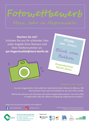 Die Fotos können bis 30.06.2021 an die Mailadresse qm-hegermühle@stern-berlin.de mit Angabe des Namens, der Telefonnummer und eines Titels für das Foto gesendet werden. Das Quartiersmanagement freut sich auf die Einsendungen und steht für Rückfragen gern unter der oben genannten Mailadresse oder per Telefon unter 03341 - 38 04 520 zur Verfügung.