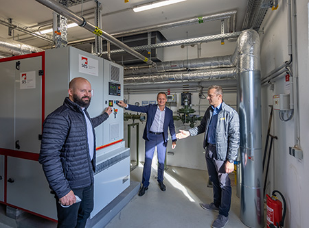 Auch Anlagen bei Kunden wie der Gemeinde Petershagen-Eggersdorf, für die EWE Planung, Bau und Betrieb übernimmt, bringt das Unternehmen auf den technisch neuesten Stand. „Jeder kann und sollte einen Beitrag für eine klimafreundliche Zukunft leisten. Ein sparsamer und nachhaltiger Umgang mit den Ressourcen sind uns daher ein wichtiges Anliegen. An vielen Stellen setzen wir uns dafür ein, beispielsweise bei der Umstellung des Verwaltungsfuhrparks auf Elektrofahrzeuge und bei der Modernisierung der Energiezentrale in unserem Grundschulzentrum am Dorfanger“, sagte Marco Rutter, Bürgermeister der Gemeinde Petershagen/Eggersdorf. Die Modernisierung der Technik sei ein gemeinsamer Beitrag der Gemeinde und ihres Partners EWE für eine zukunftsfähige, klimaschonende Energieversorgung im Ort.