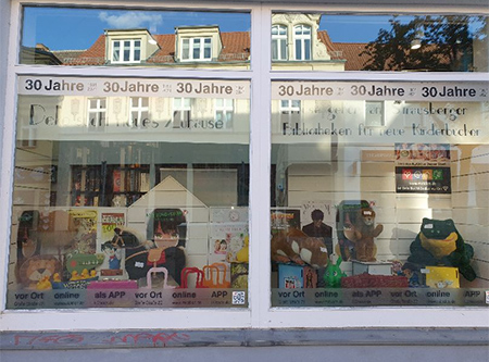 Unter der Überschrift "Deko sucht neues Zuhause" haben die Mitarbeiterinnen der Buchhandlung ein Schaufenster mit attraktiven Dekorationsmaterial aus unseren Beständen zum Erwerb gestaltet. Der Erlös daraus kommt dem Erwerb von Kinderbüchern unserer Bibliothek zu Gute.