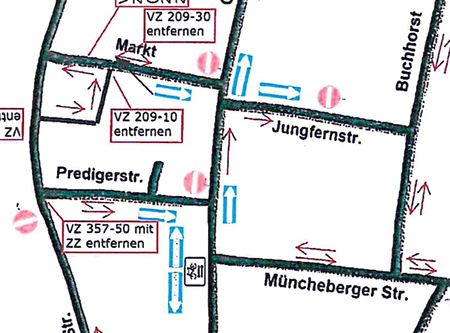 Die erforderliche Verkehrsrechtliche Anordnung wurde dementsprechend erteilt. Die Große Straße wird zwischen Grünstraße und Klosterstraße zur geteilten Einbahnstraße – zwischen Müncheberger Straße und Grünstraße in südliche Richtung (Ri. Sparkasse), zwischen Müncheberger Straße und Klosterstraße in