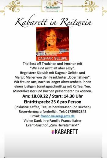 Am 18. September 2022 startet um 14:30 Uhr im Reitweiner Event-Gasthof Zum Heiratsmarkt Livekabarett mit Dagmar Gelbke.