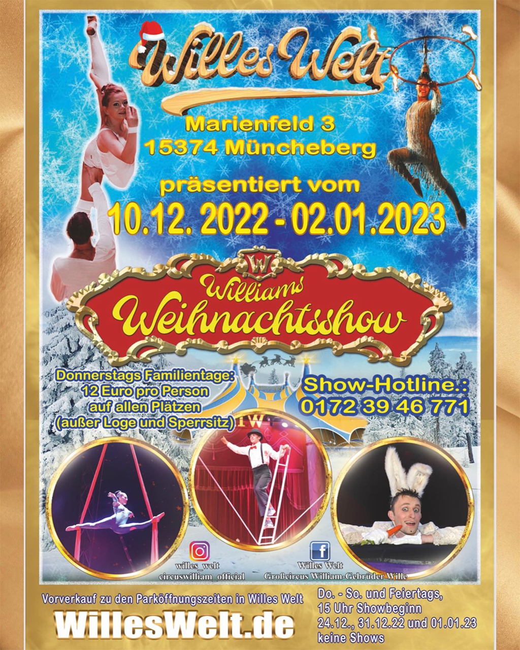 Der Müncheberger Großzirkus William führt seine große Weihnachtsshow dieses Jahr in Müncheberg auf. Vom 10. Dezember 2022 bis 02. Januar 2022, jeweils um 15:00 Uhr können die Besucher in Willes Welt, Marienfeld 3 in Müncheberg Zirkusluft schnuppern. Für das Zirkuserlebnis muss in diesem Jahr nicht nach Berlin gefahren werden, das gibt es vor Ort. Artisten, Akrobaten, Dompteure, Clowns und viele Tiere werden für das hochgeschätzte Publikum in die Manege treten und eine tolle Show aufführen. Für das Zirkuserlebnis wird Eintritt erhoben. Mit der erworbenen Eintrittskarte können Erwachsene ein kostenfreies Heißgetränk und Kinder eine kostenlose Karussellfahrt in Willes Winterwelt genießen. Show Hotline: 0172 / 39 46 771.