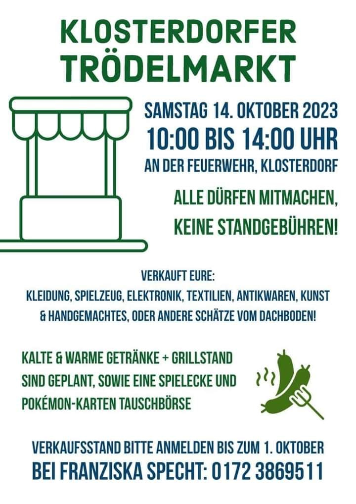 Am Samtstag, den 14. Oktober 2023 findet von 10:00 Uhr bis 14:00 Uhr der Klosterdorfer Trödelmarkt direkt an der Feuerwehr statt. Alle dürfen mitmachen, es gibt keine Standgebühren!